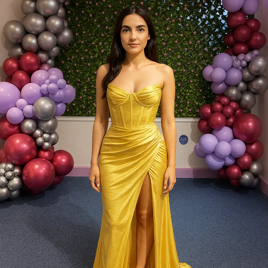 Anabella is a glossy A-line prom dress with a draped sweetheart bodice, slim straps, a supportive corset-style fit and a thigh-high split—plus handy pockets. Available in Navy, Cherry Red, Light Pink, Sea Breeze and Lemon, it’s the perfect mix of swish, comfort and photo-ready glamour.