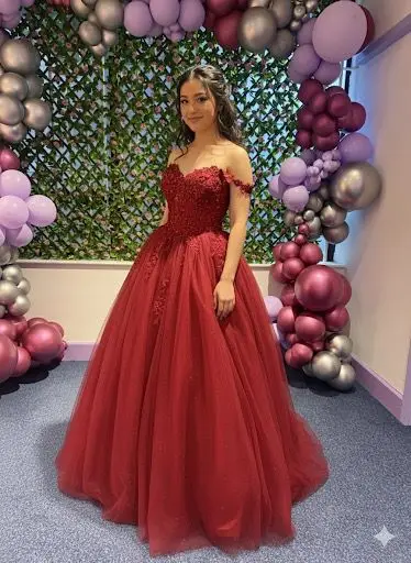 Robbi is a floral lace and glitter tulle ballgown with a corseted bodice, sweetheart neckline and delicate straps designed for show-stopping prom entrances. In dramatic Burgundy or dreamy Baby Pink, this gown gives a sculpted, secure fit through the top and a sweeping full skirt that looks incredible in every twirl and photo.