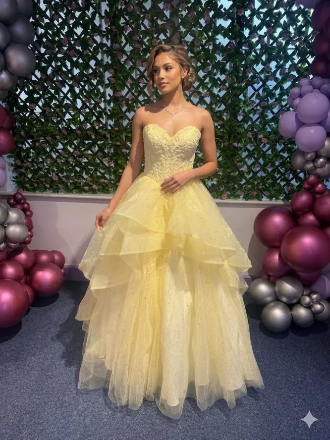Luna by Prom Frocks is a strapless ballgown prom dress with a sweetheart neckline, glitter tulle layers and a structured applique corset bodice for a standout princess look. Available in Pink, Blue and Yellow, it features a lace-up back and dramatic tiered skirt for beautiful shape, sparkle and movement.