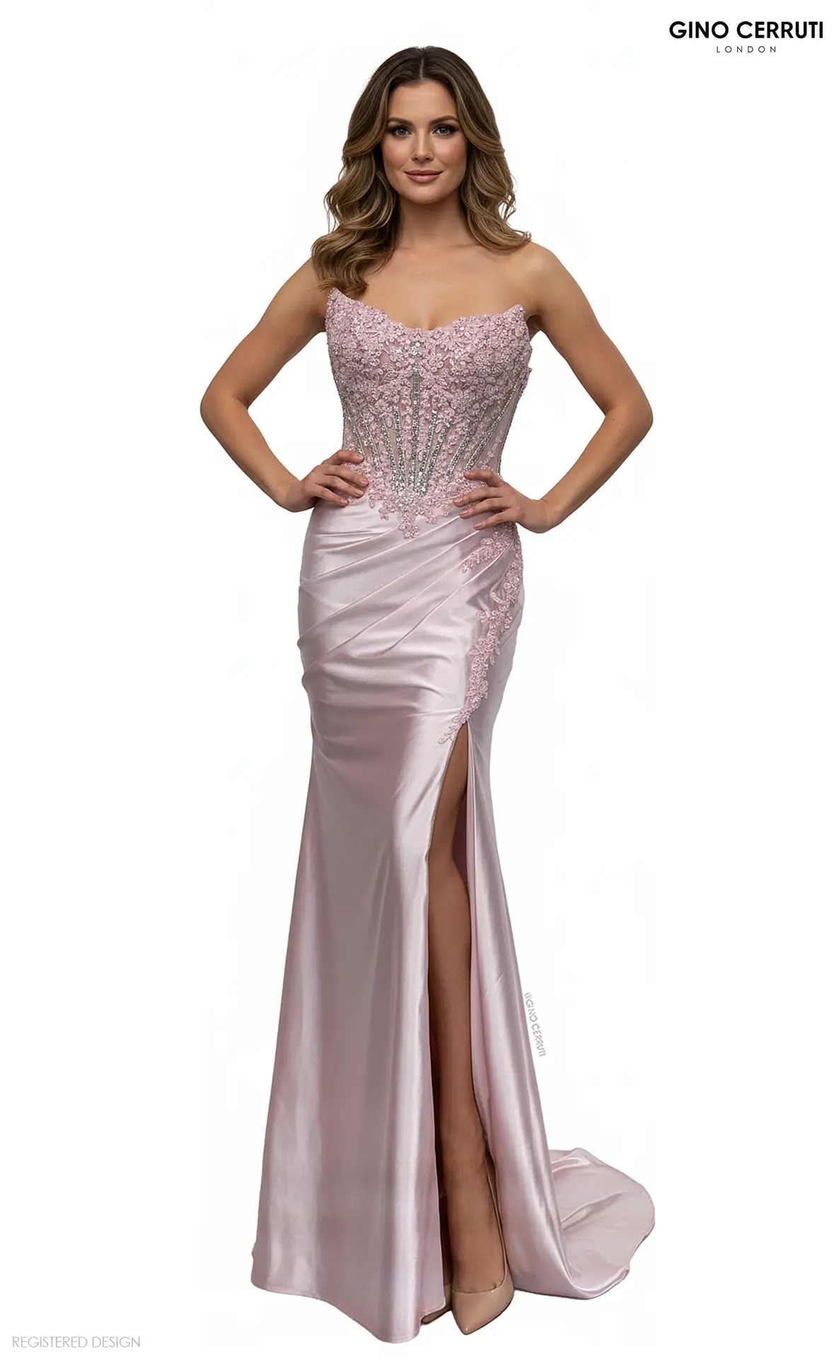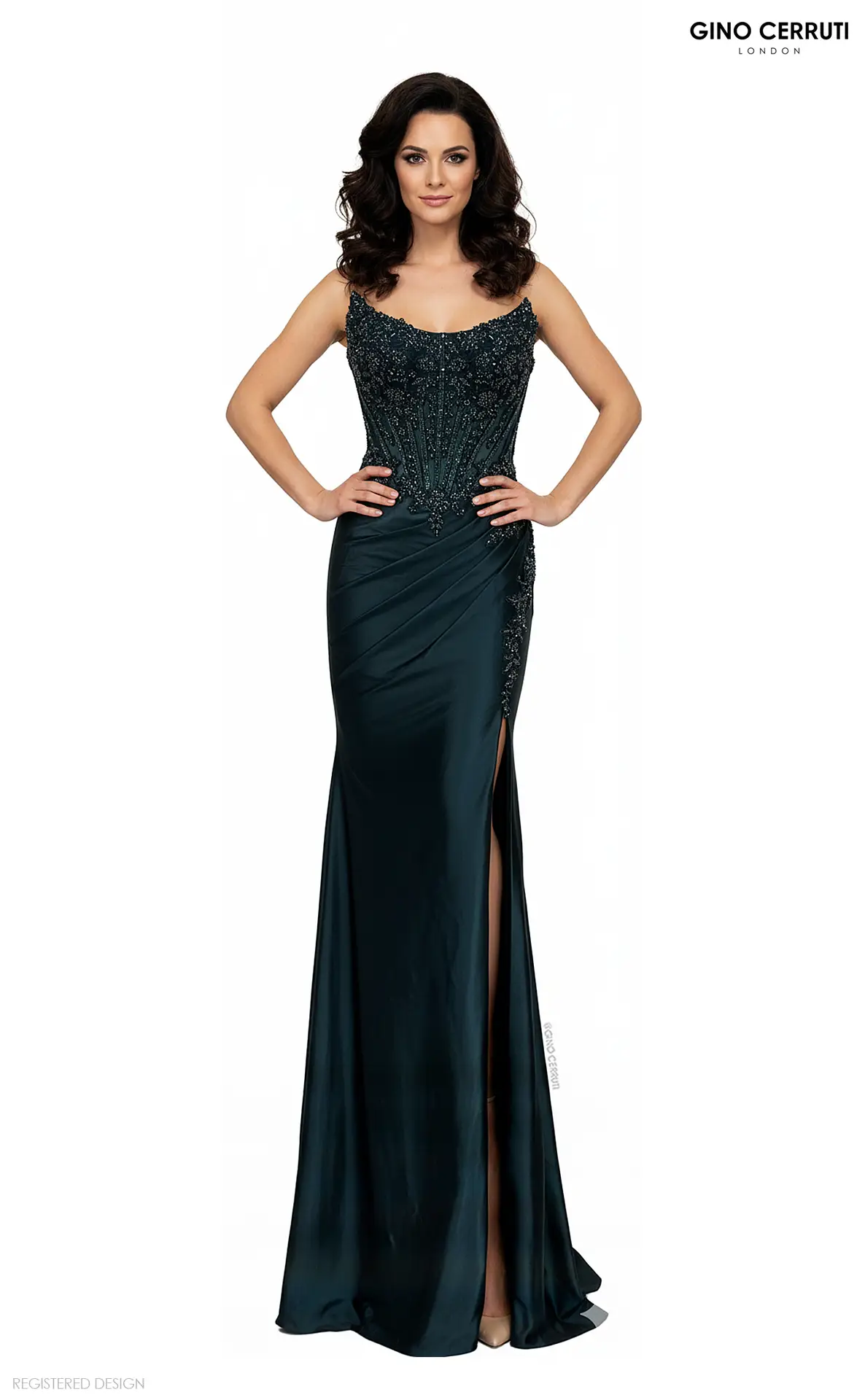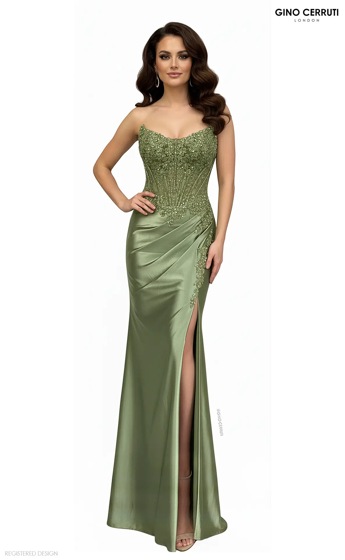 Aisha is a sleek, strapless prom gown with a beaded lace bodice, flattering ruched hip detail and a dramatic thigh-high split, finished with a smooth, flowing train that feels straight off the red carpet. Available in dreamy Light Pink, cool Silver Blue, rich Teal and lush Olive Green, it’s a real show-stopper in every colour.