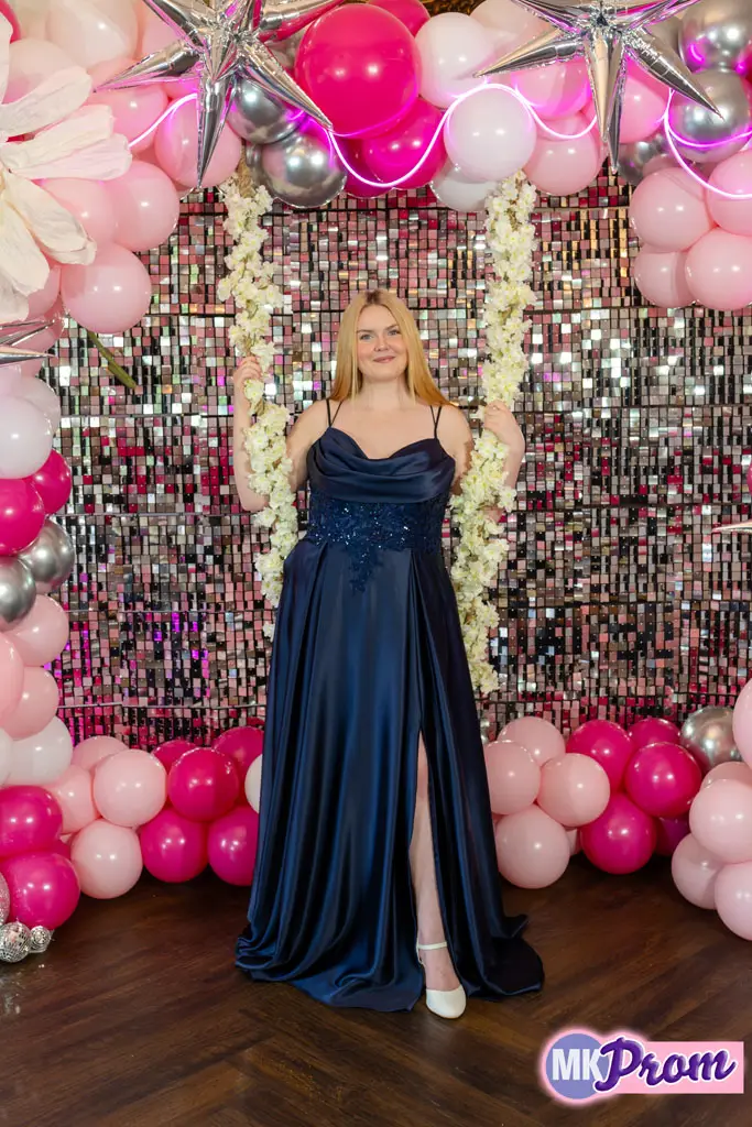 Chiara is a sleek satin A-line with a draped cowl neckline, delicately embellished lace bodice and thigh-high slit; it moves beautifully and hides pockets in the skirt. Colours: Emerald Glow and Summer Midnight.
