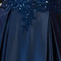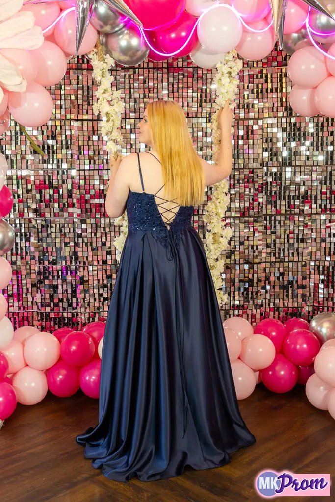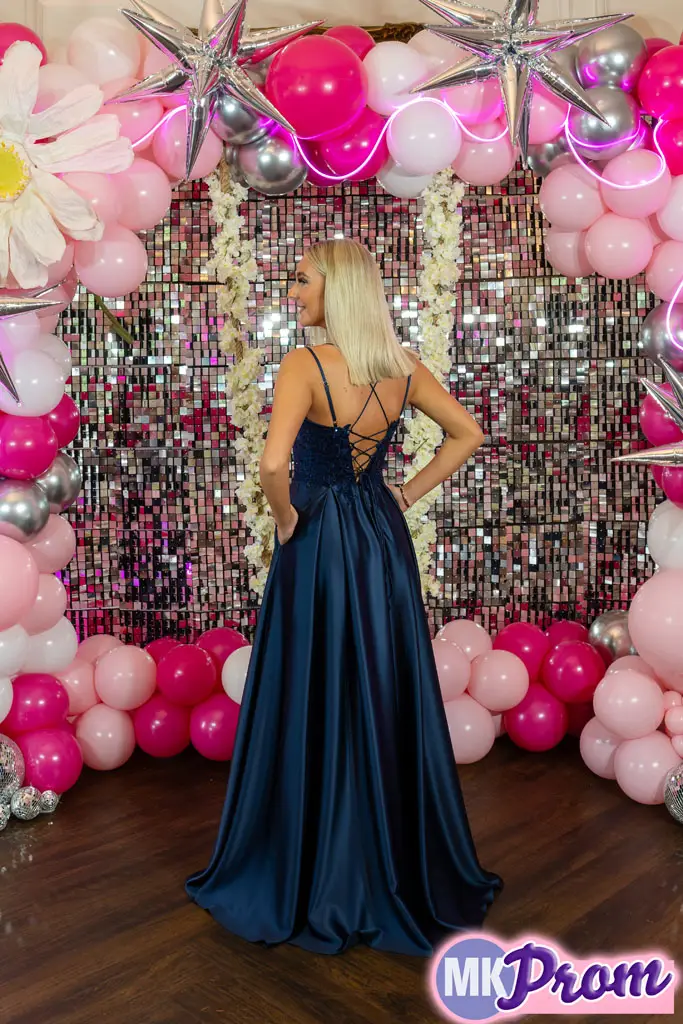 A structured lace-appliqué bodice and slim straps keep the bust secure, while the satin A-line skirt glides with effortless movement and reveals a confident slit. The waist is smooth and comfortable with a discreet back fastening, and side pockets add practicality; style with crystal heels and a simple bracelet to let the sheen do the talking.
