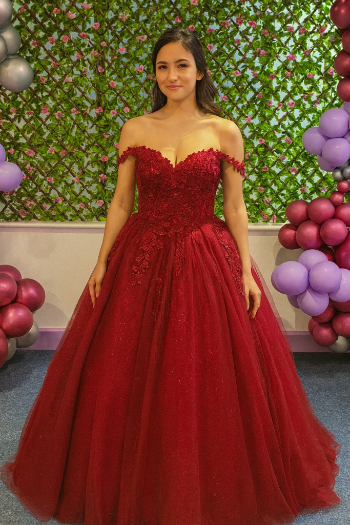 All-out prom energy: an off-the-shoulder sweetheart bodice covered in lace appliqué and sparkle, flowing into a full glitter tulle ballgown skirt with a soft sweep hem. Comfort’s sorted with built-in cups and boning, plus a neat low back with concealed zip. Colours: Sunrise Pink and Burgundy Glow.