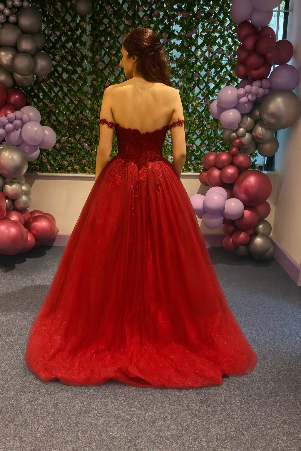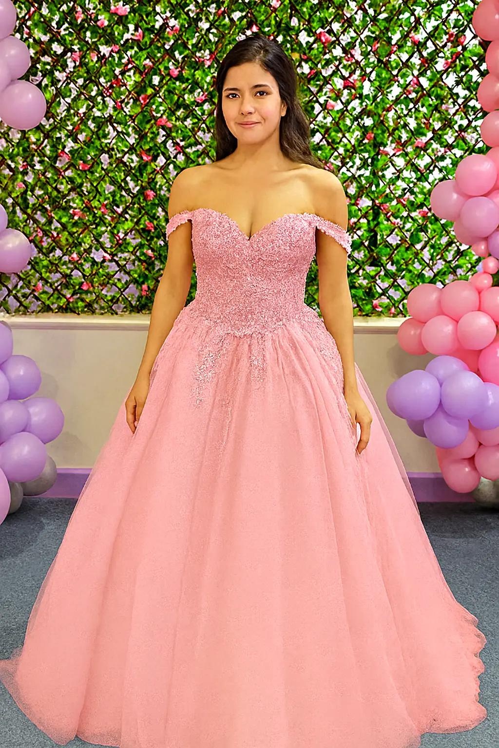 All-out prom energy: an off-the-shoulder sweetheart bodice covered in lace appliqué and sparkle, flowing into a full glitter tulle ballgown skirt with a soft sweep hem. Comfort’s sorted with built-in cups and boning, plus a neat low back with concealed zip. Colours: Sunrise Pink and Burgundy Glow.
