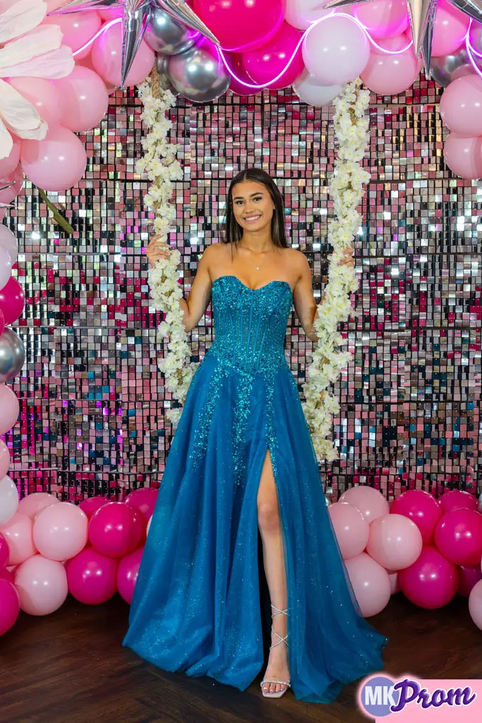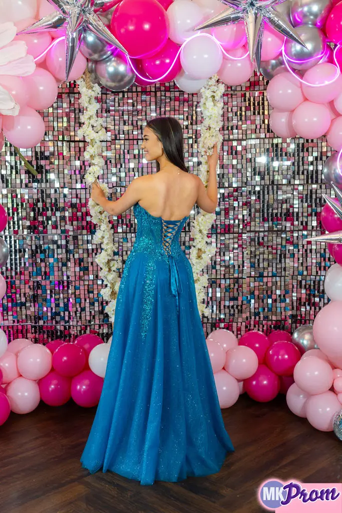 The structured boned corset shapes the waist while the lace-up ribbon back lets you fine-tune the fit; layers of soft sparkle tulle flow from the waist into a floor-grazing hem with a confident leg split, and light lining plus cups keep everything comfortable and secure—finish with delicate straps or a simple necklace to let the glitter do the talking.