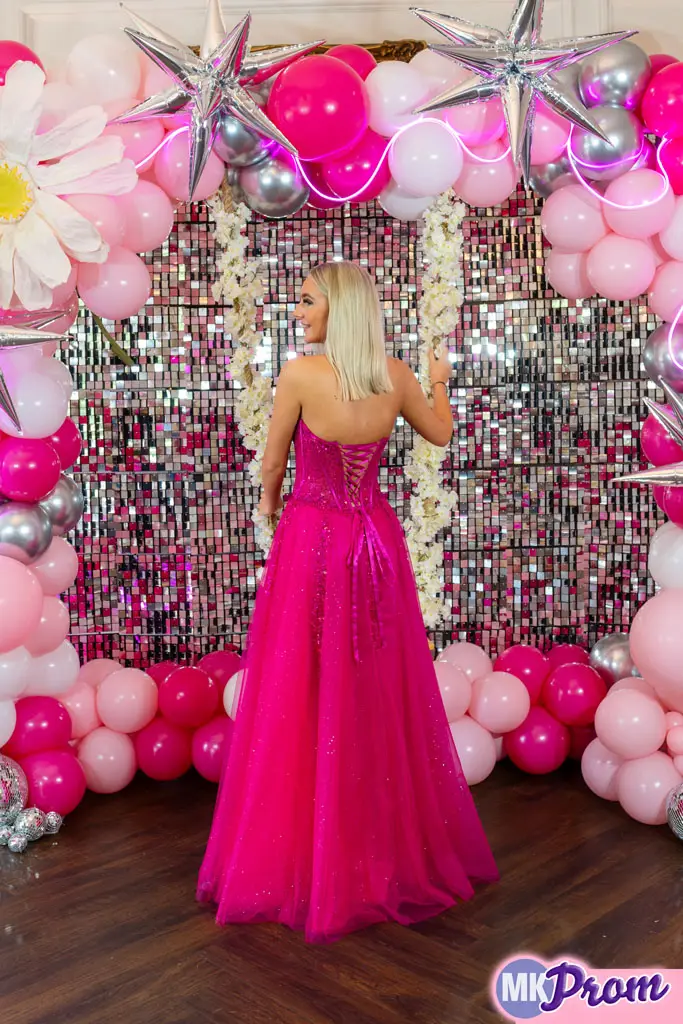 A showstopper with a strapless sweetheart corset bodice, glitter-tulle A-line skirt and a daring thigh-high slit for effortless movement; colours: Vibrant Jade and Vibrant Pink.