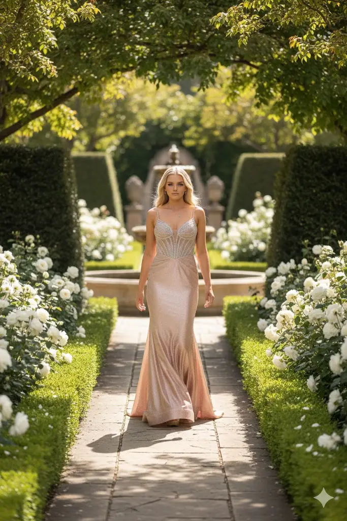 A boned, illusion bodice shapes and secures, while the lace-up corset back lets you cinch the waist just right. Stretch satin skims then flares for easy movement, finishing in a soft sweep train with no slit to worry about. Wear with simple studs and metallic heels for a clean, polished look.