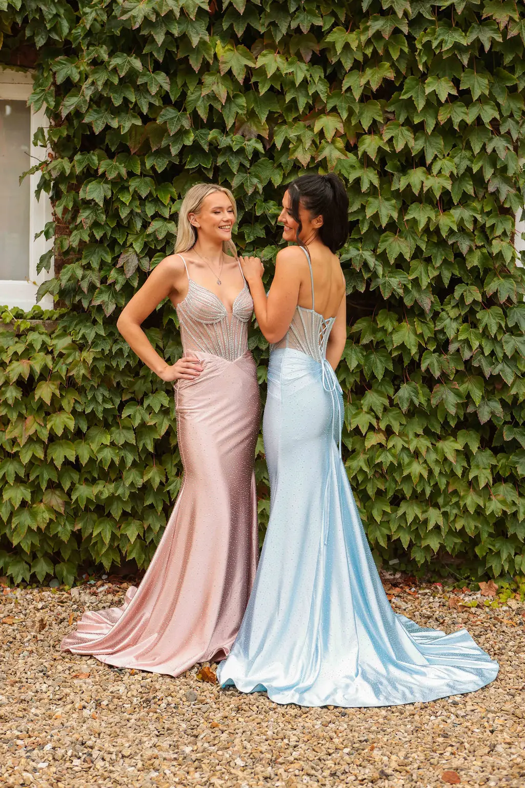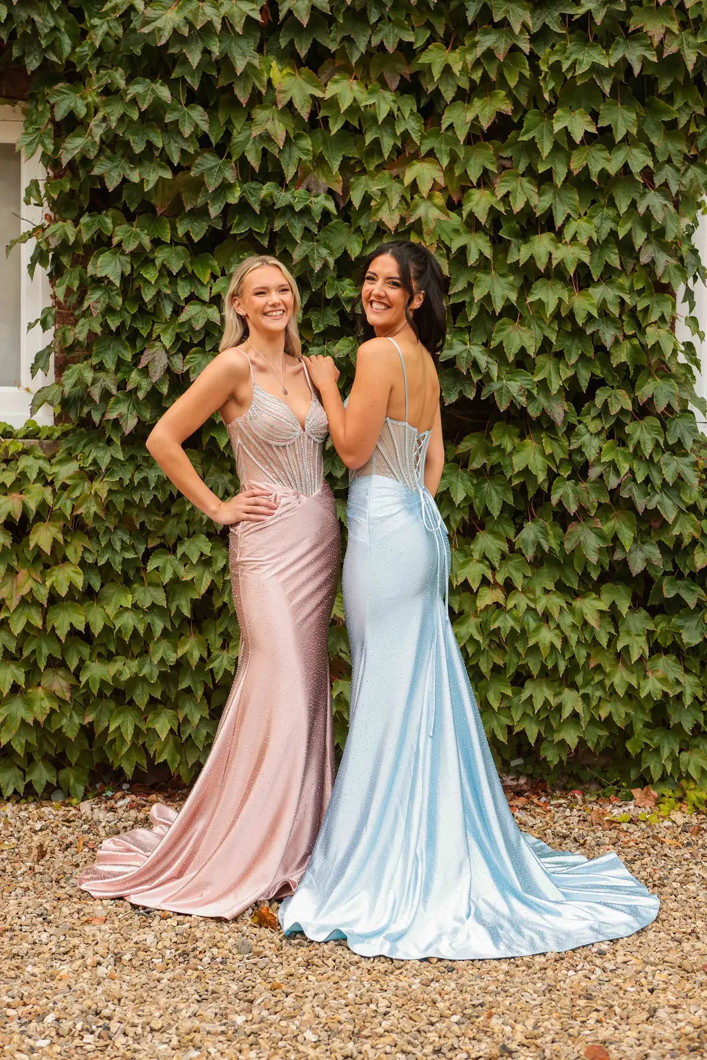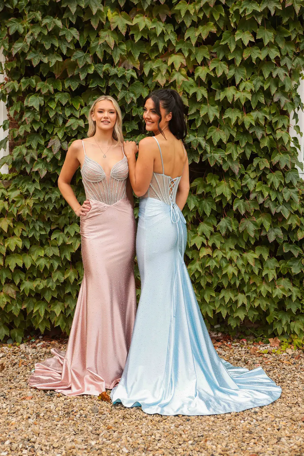 Grace is a curve-loving mermaid with a plunging sweetheart illusion bodice, slim spaghetti straps and a shimmer of heat-set crystals over stretch satin; the sweep train and adjustable lace-up back keep it glam yet comfy. Available in Champagne and Light Blue.