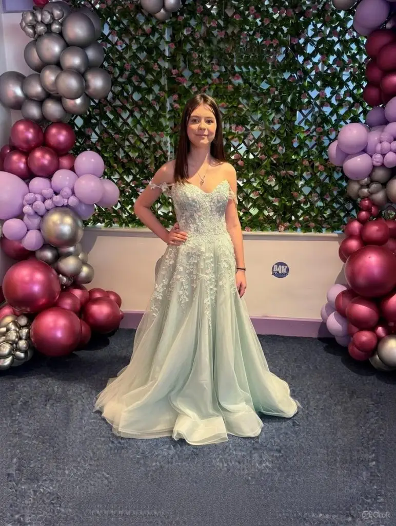 The Ivy features a fitted, lightly boned bodice for support, with a lace-up corset back so you can pull it in or let it out for a comfy, secure fit on the night; the sweetheart neckline and slim floral straps sit neatly on the shoulders, while the full-length tulle A-line skirt skims over the hips and gives lots of movement without being heavy, making it easy to walk, pose for photos and dance. Soft lining keeps it comfortable against the skin, and the subtle sparkle woven through the applique and skirt gives just the right amount of shine under party lights.