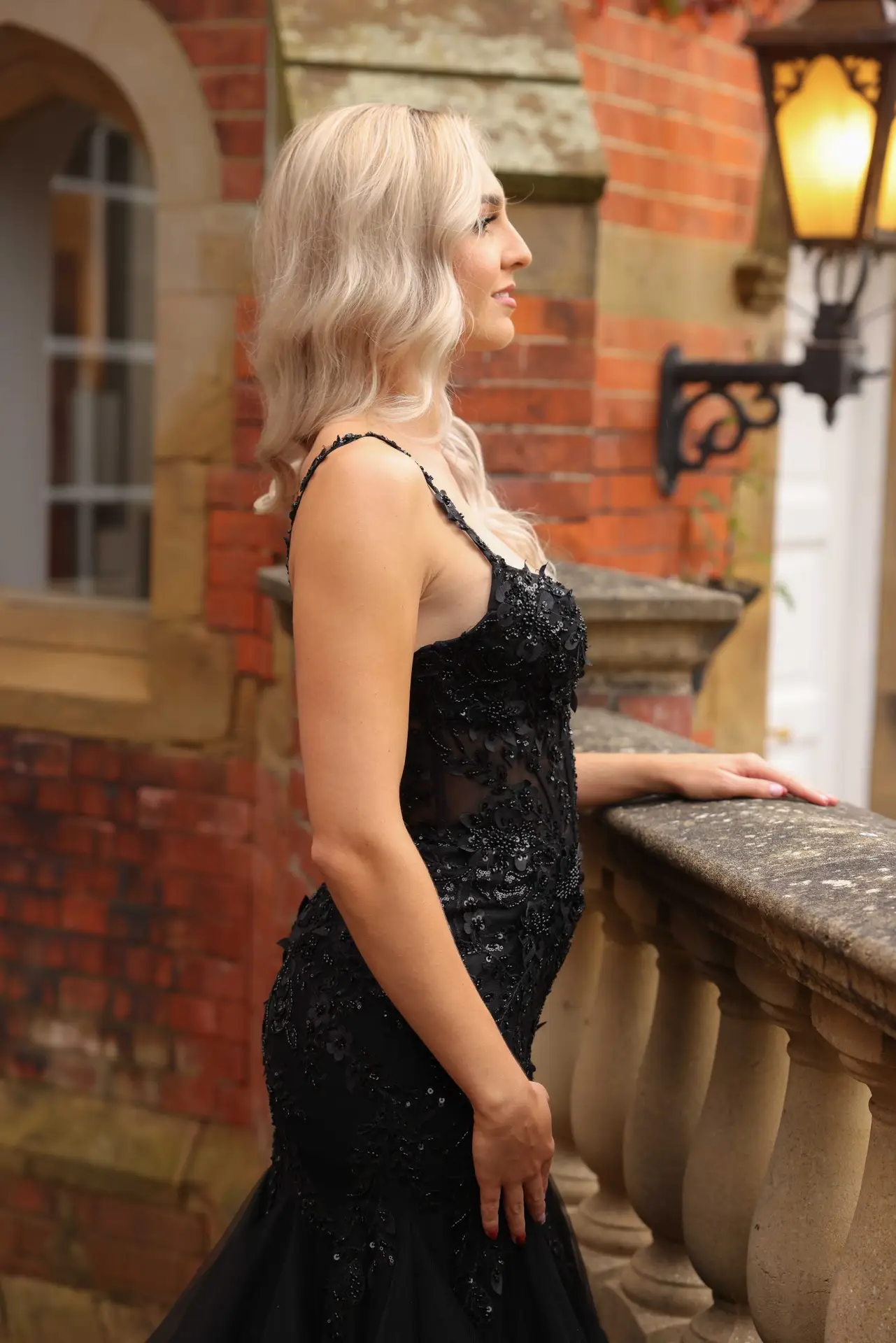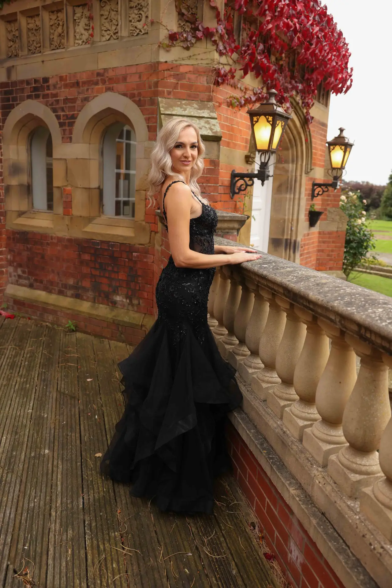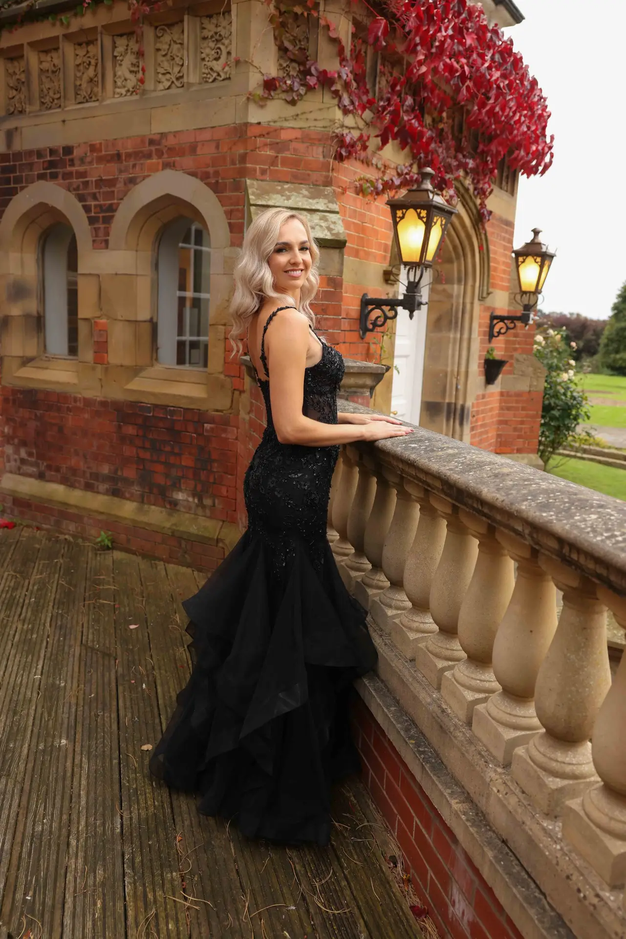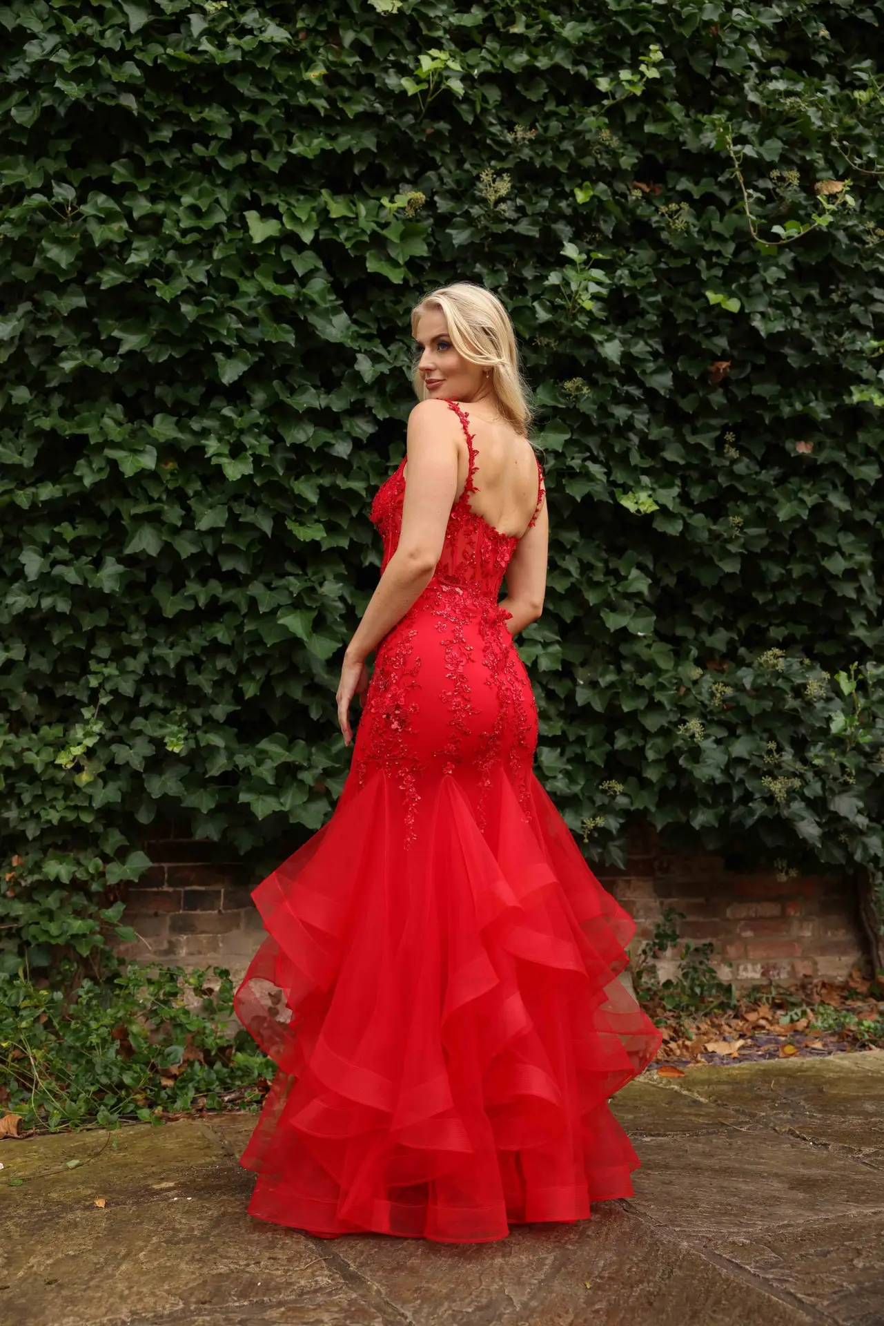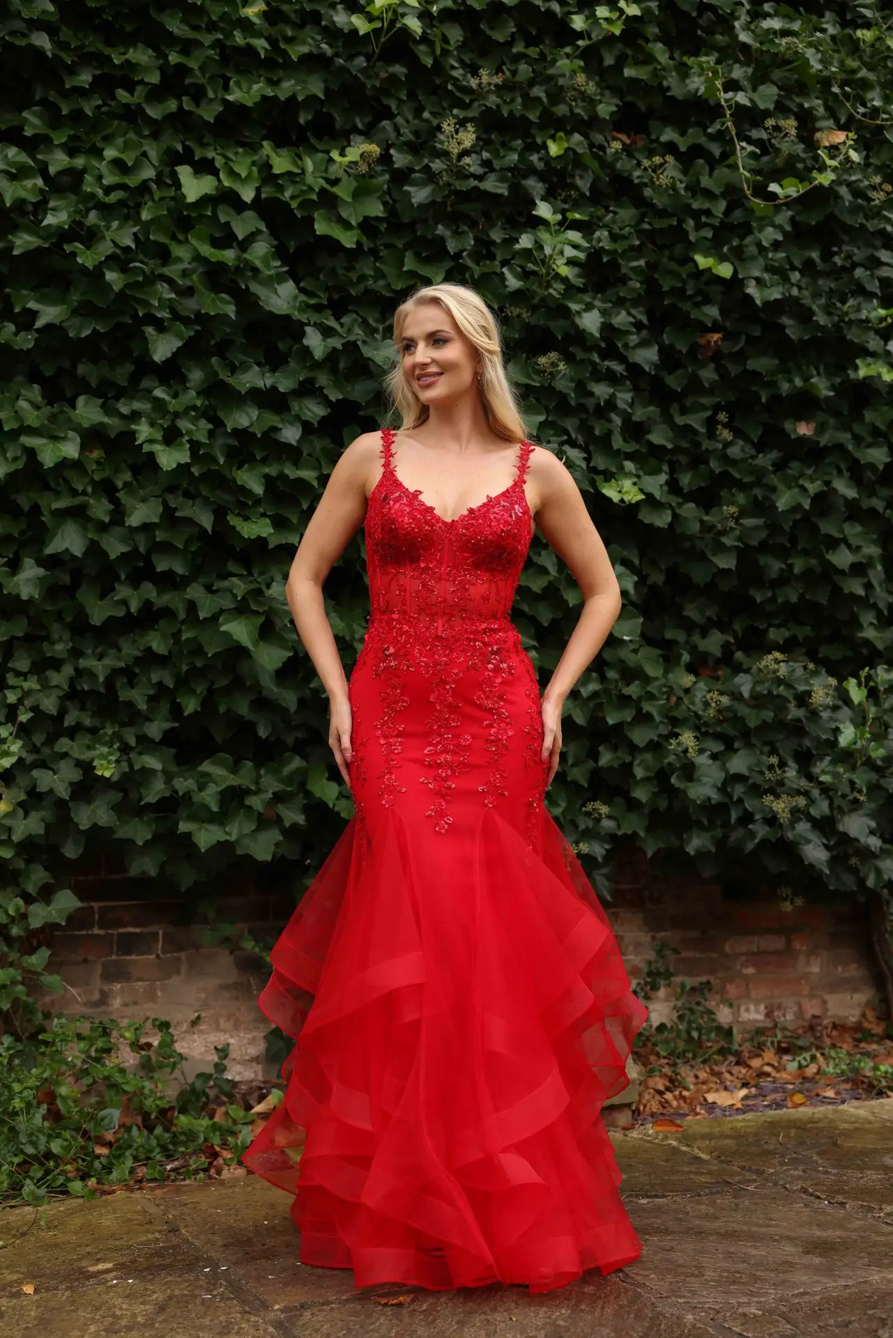 The structured bodice with visible boning shapes the waist while the beaded lace adds texture and sparkle; slim through the hip before flaring into soft, layered ruffles for swish and drama. A scoop back and fine embellished straps feel secure, fastening with a concealed zip for a clean finish. Comfortable to dance in, it suits simple jewellery and a sleek heel—let the silhouette and embellishment do the talking.