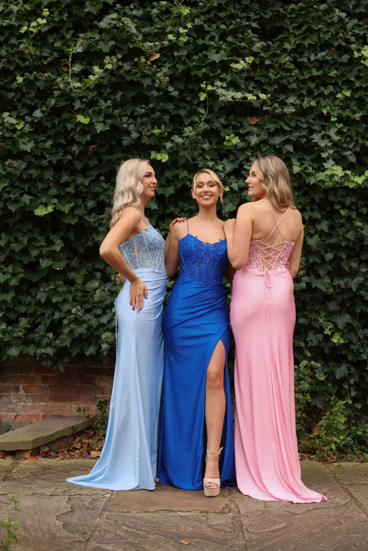 Lena blends a lace corset bodice with a glitter-kissed stretch jersey skirt, featuring spaghetti straps, a sweetheart neckline, a thigh-high slit and a sweep train; available in Frosty Pink, Royal Blue and Summer Sky.