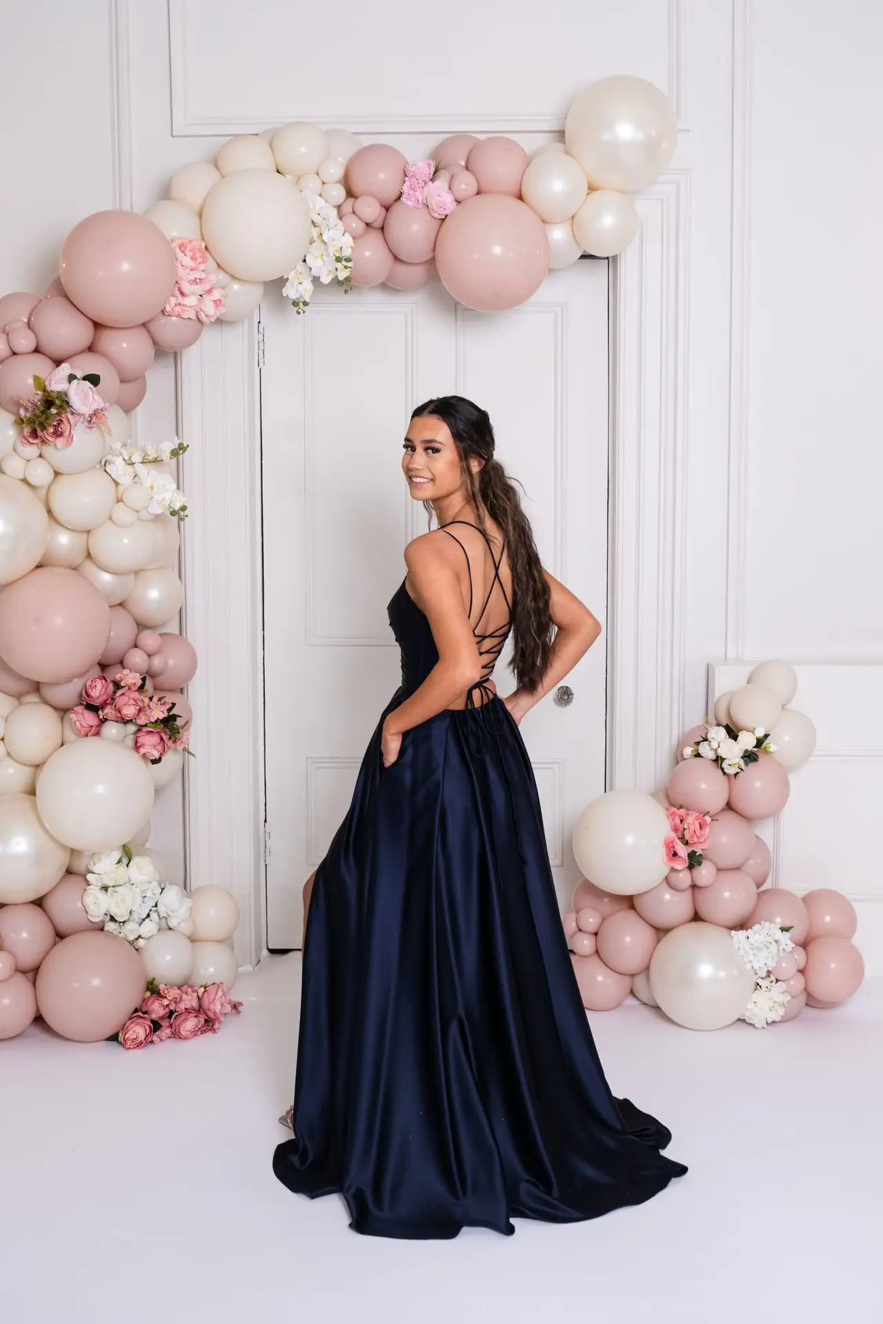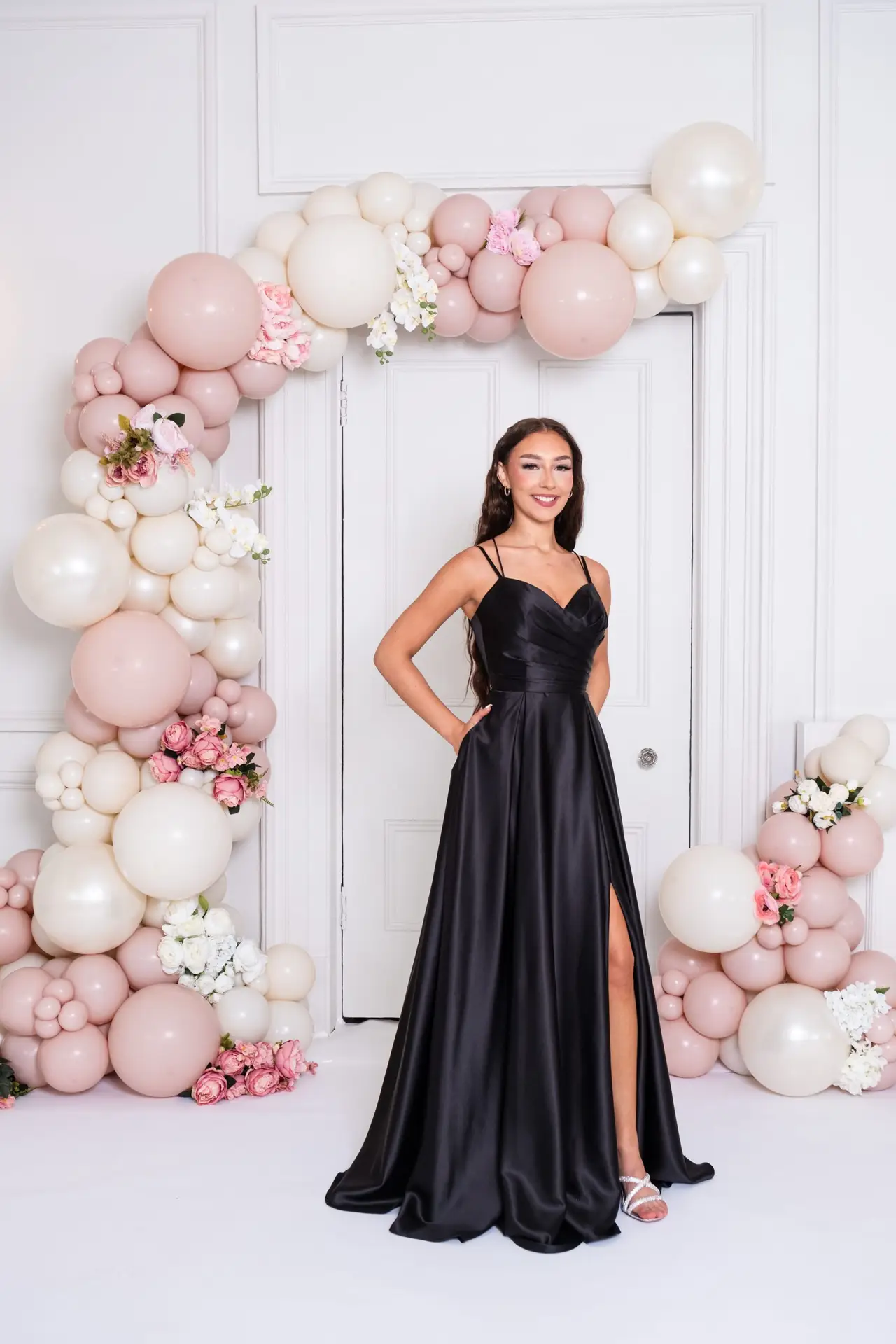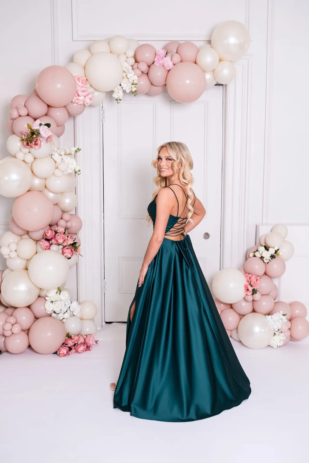 Lilliana is your sleek satin showstopper with a sweetheart bodice, double spaghetti straps, side split and hidden pockets—easy to wear and mega photogenic. Choose from Navy, Green, Red or Black.