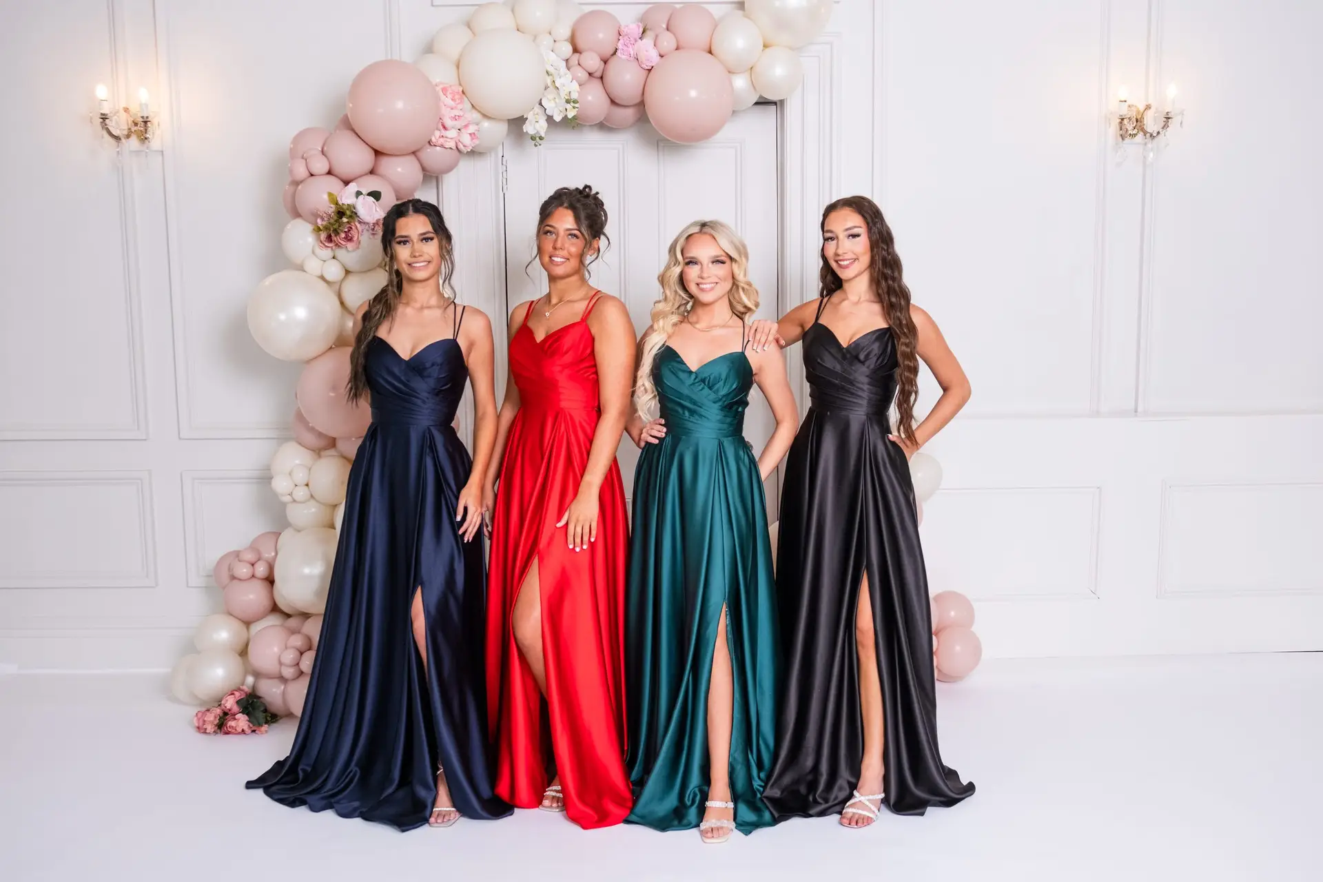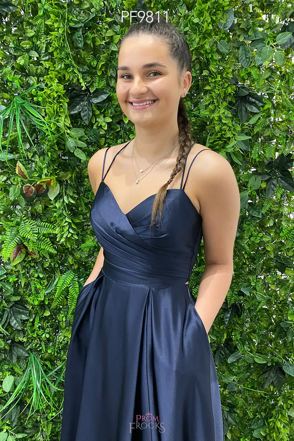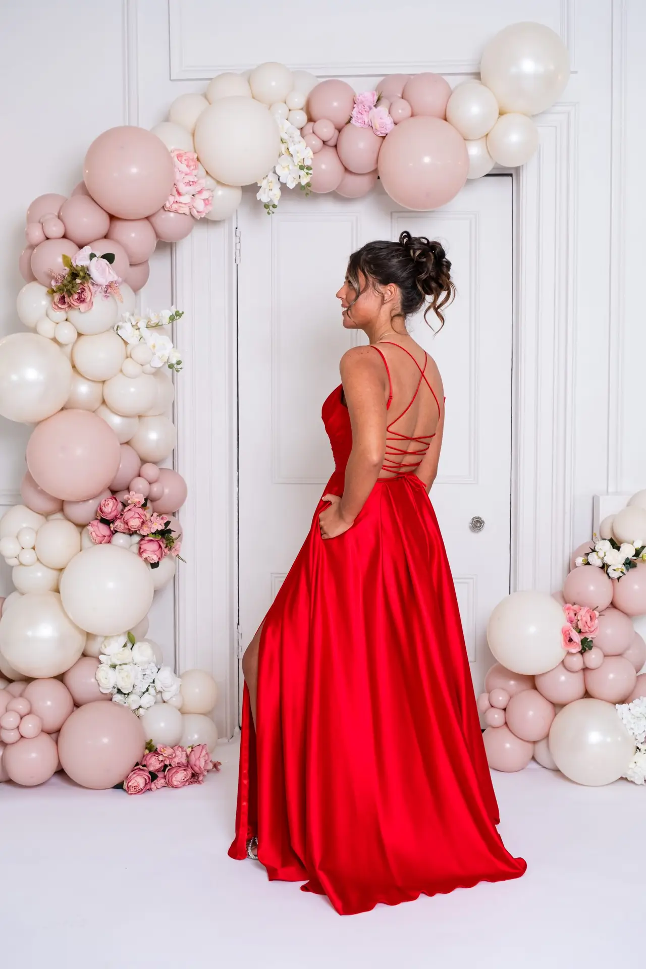 Lilliana is your sleek satin showstopper with a sweetheart bodice, double spaghetti straps, side split and hidden pockets—easy to wear and mega photogenic. Choose from Navy, Green, Red or Black.