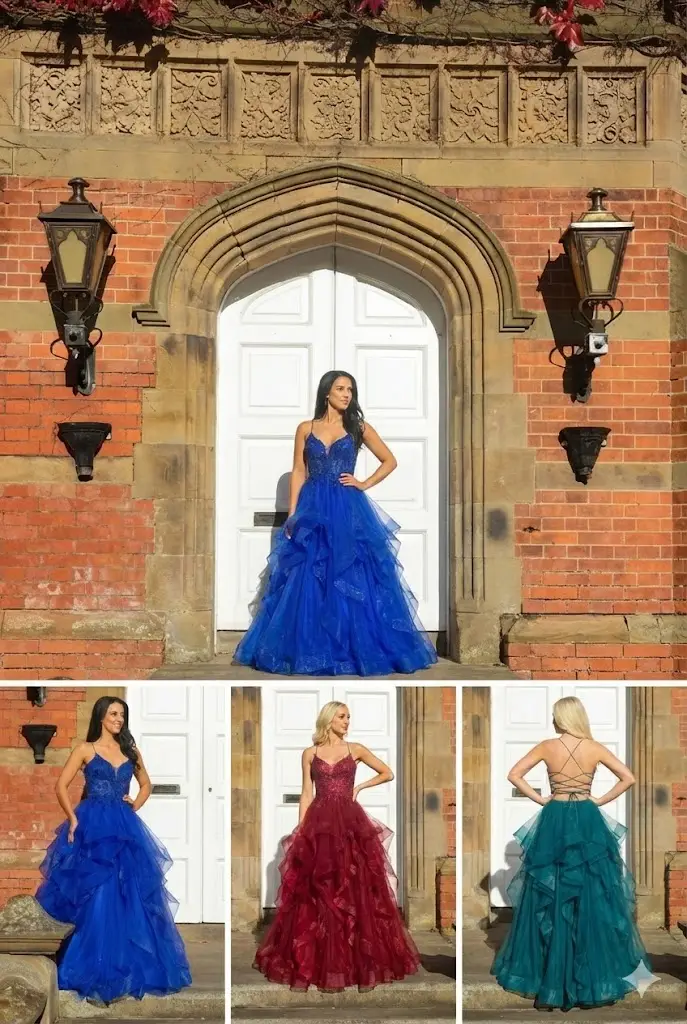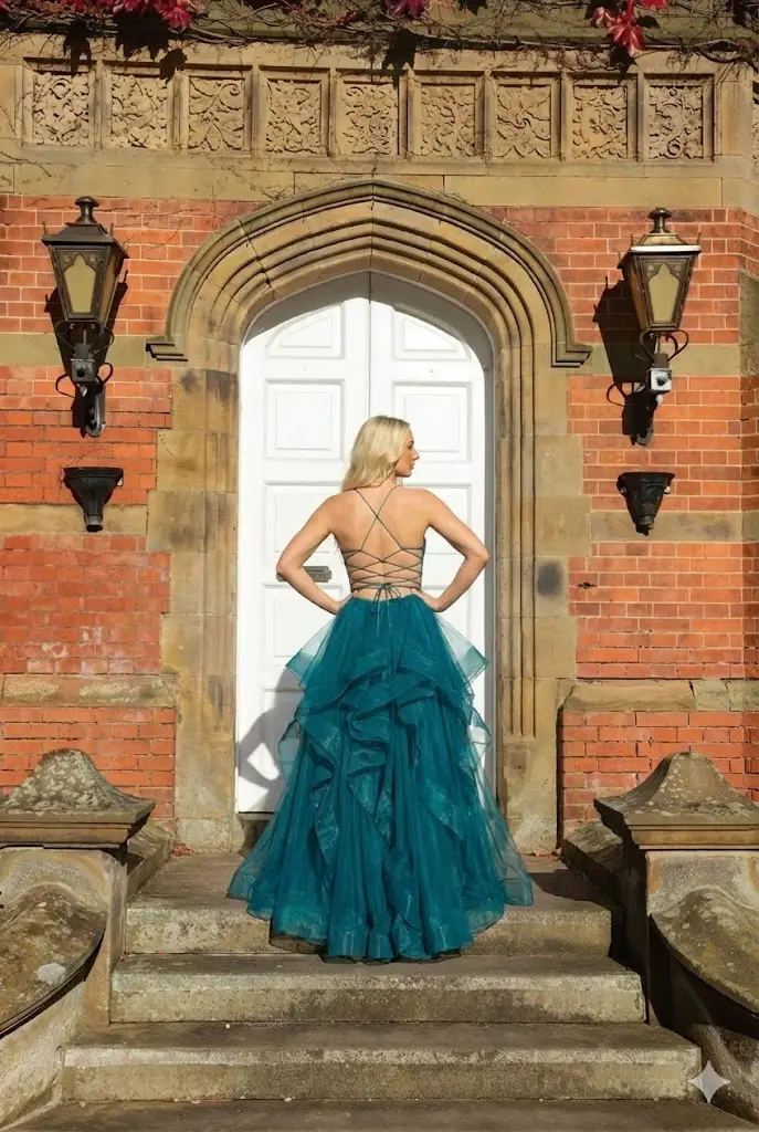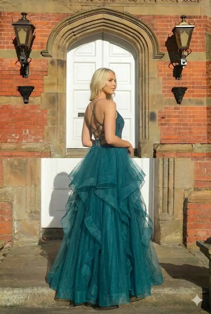 A fitted bodice with a gentle plunge neckline and built-in support defines the waist before kicking out into a layered tulle skirt that moves beautifully on the dancefloor, while slim spaghetti straps and a lace-up corset back keep everything feeling secure yet adjustable so you can nip the waist in and still breathe; style with simple jewellery and a soft curl or up-do and let the colour and ruffles do the talking.