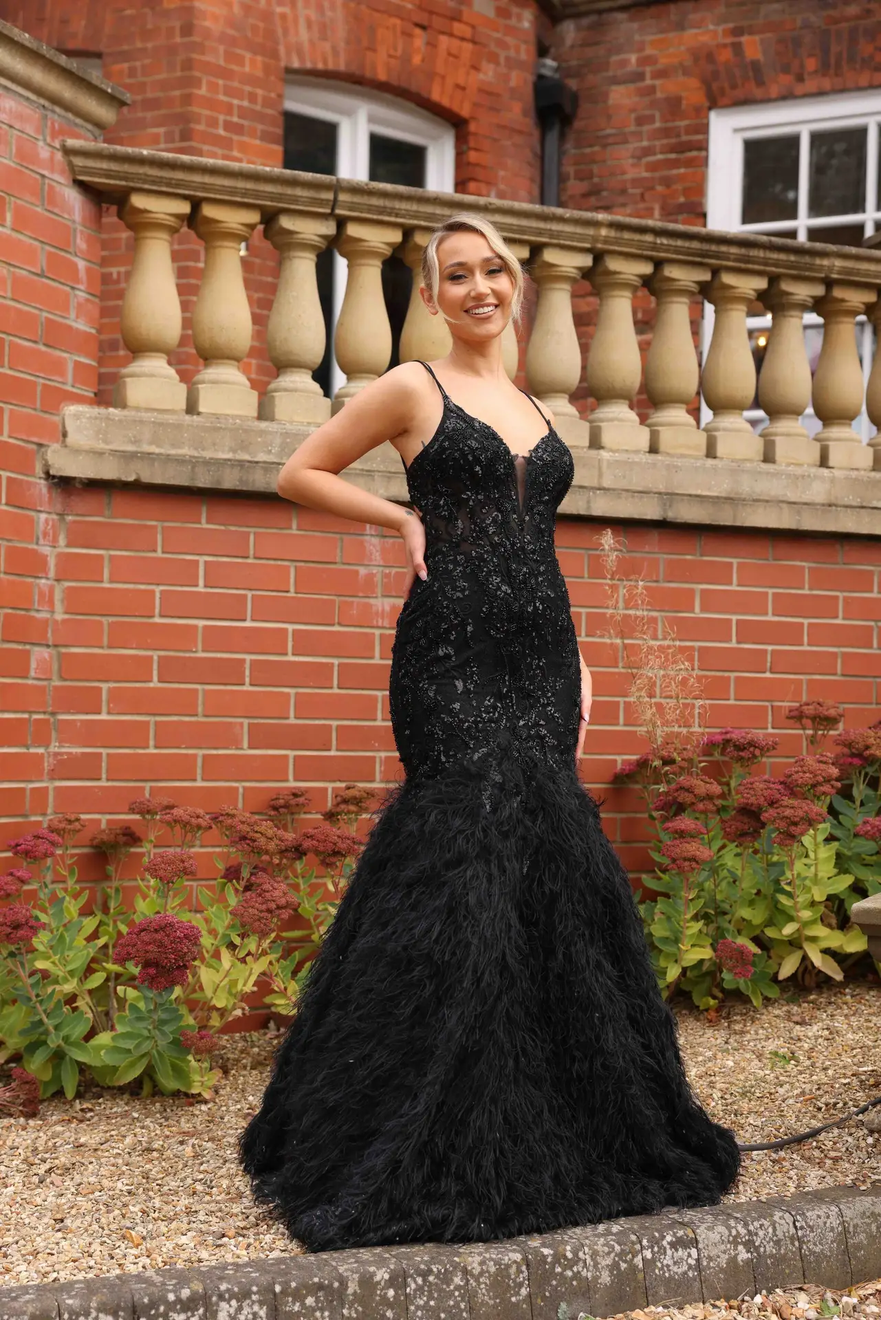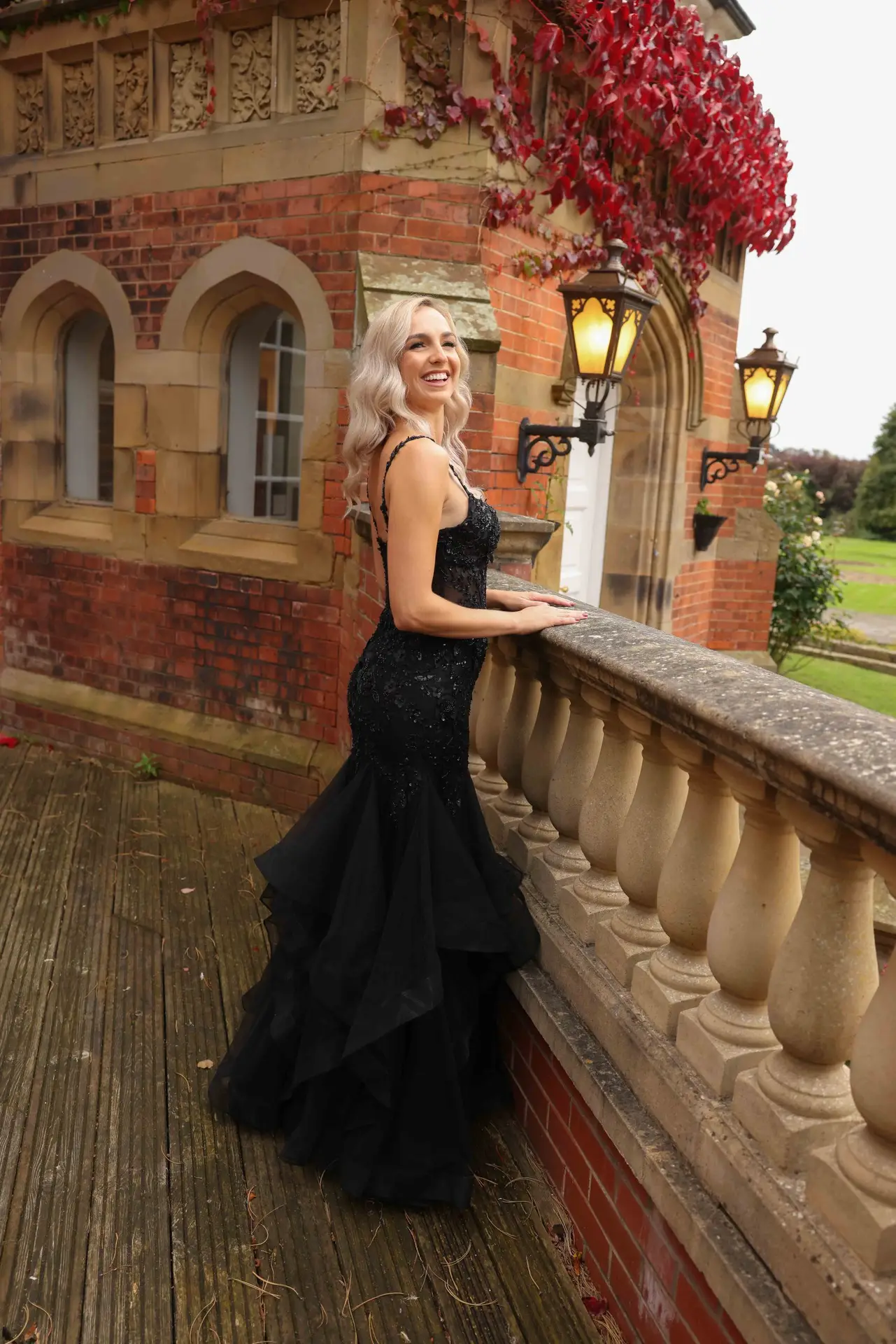Josefina is a mermaid gown with a corseted, beaded-lace bodice, slim hips and a cascade of tiered organza ruffles for high-impact movement. Offered in Shimmering Anthracyte and Siren Red, its scoop back and concealed zip keep the look sleek while the sparkle steals the spotlight.