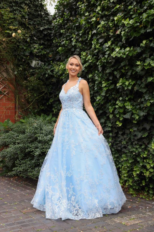 Estelle is a romantic A-line gown in Powder Blue with a floral lace illusion bodice, V-neck and lace straps, and a flowing tulle skirt finished with a soft sweep hem. A low V-back with concealed zip and gentle structure keeps the look secure yet comfortable, perfect for dancing the night away.