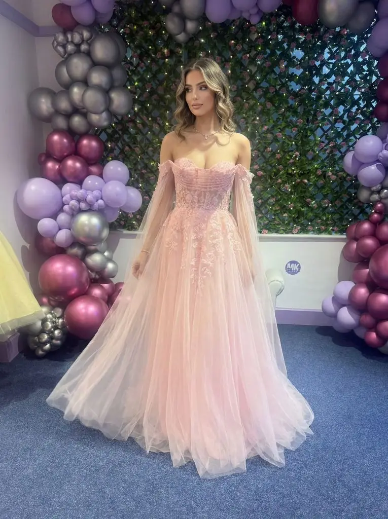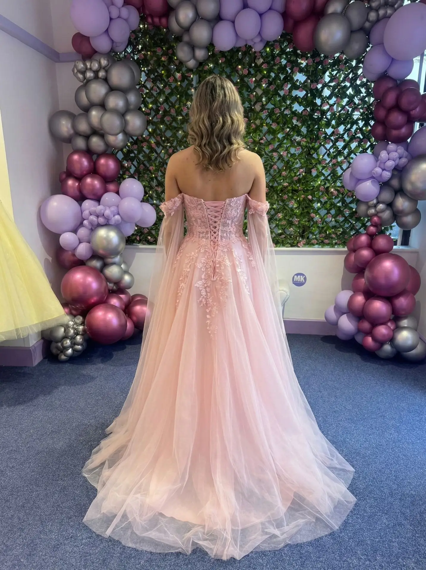 Solana is a blush pink, off-the-shoulder gown with a softly corseted bodice, floral lace detailing and a flowing tulle skirt, giving you all the princess vibes without any fuss in beautiful Blush Pink.