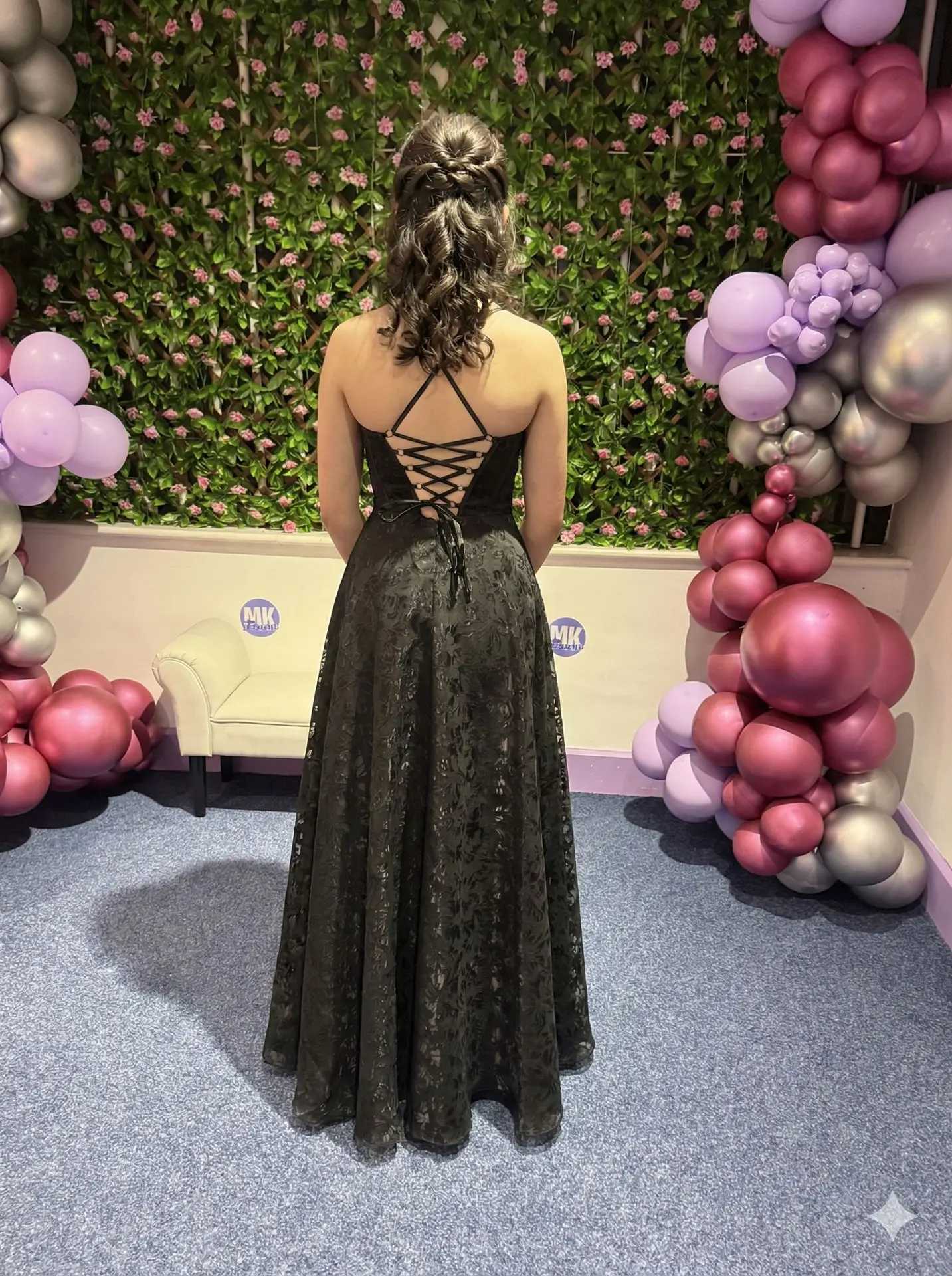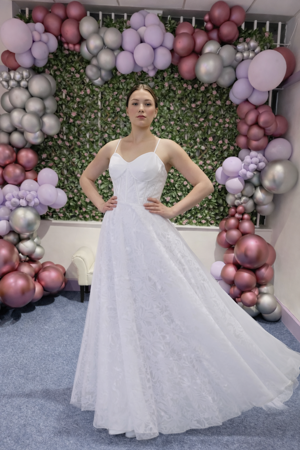 The Tabitha features a structured bodice with light boning and padded cups for support, slim straps that balance the open shoulders, and a lace-up back so you can really cinch the waist for a secure fit. The full A-line skirt falls to the floor with easy swish, the floral jacquard overlay gives texture without feeling heavy, and the smooth lining plus hidden pockets keep it practical and comfy from arrivals to last dance; just add simple jewellery and soft curls to let the dress do the talking.