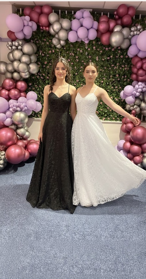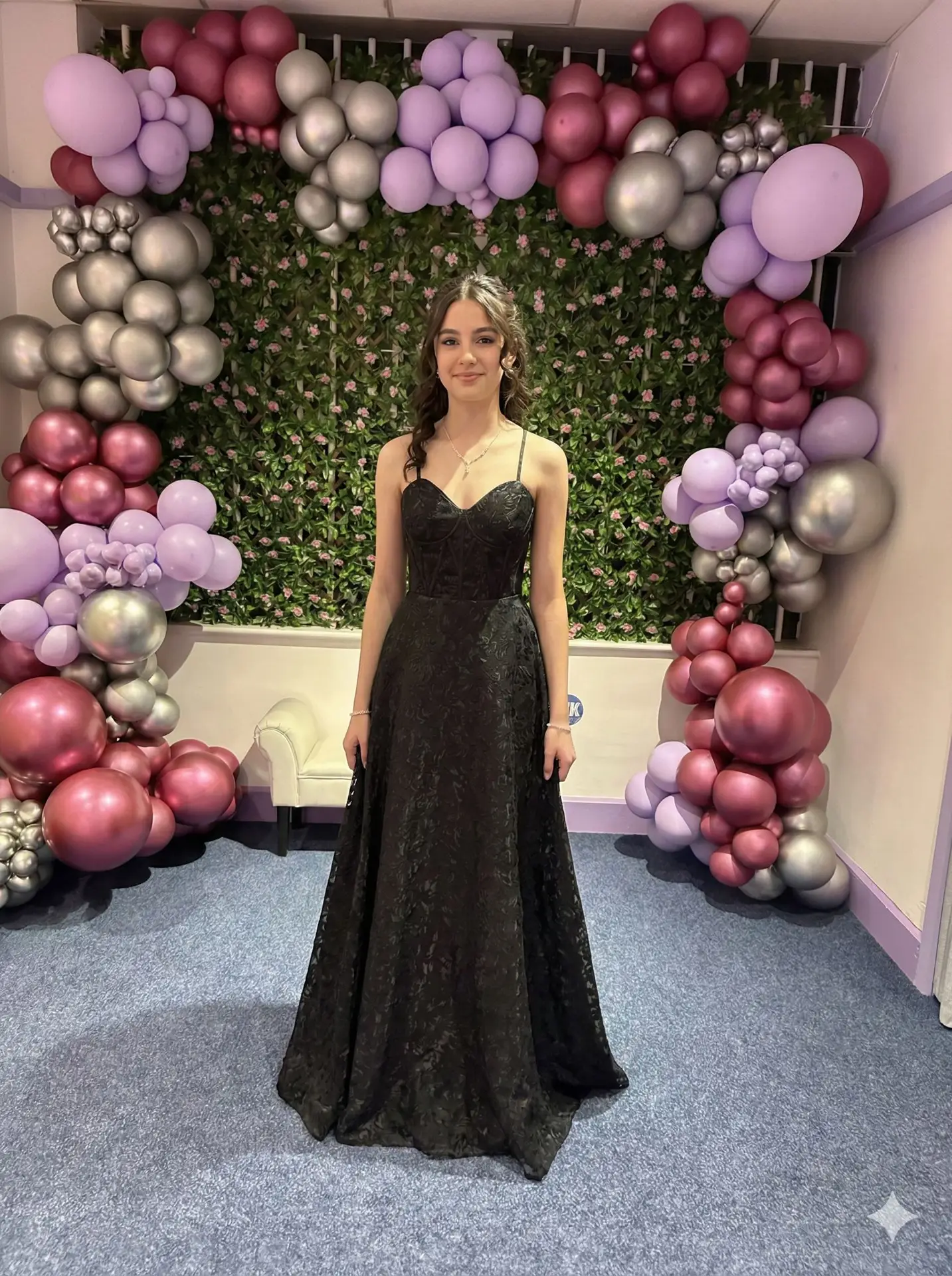 Tabitha is a romantic A-line prom dress with a sweetheart neckline, corset-style bodice, floral jacquard skirt and handy hidden pockets, available in chic Black or dreamy Ivory.