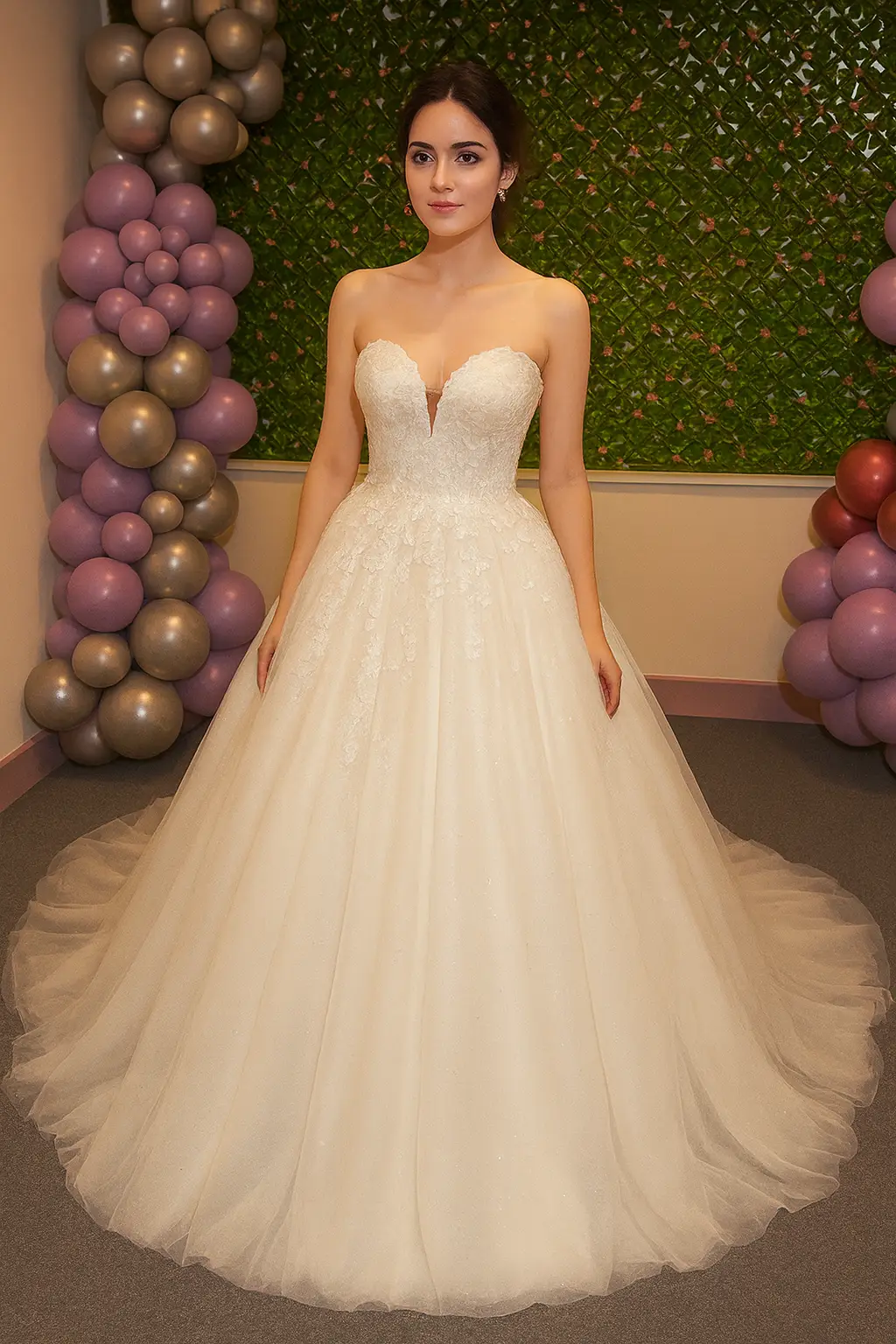 The bodice is corset-structured with soft cups and boning for all-night security, flowing into a full layered skirt that moves beautifully; the back closes with a neat centre zip and the hem drifts into a gentle train—just add simple studs and a sleek clutch and let the sparkle do the talking.