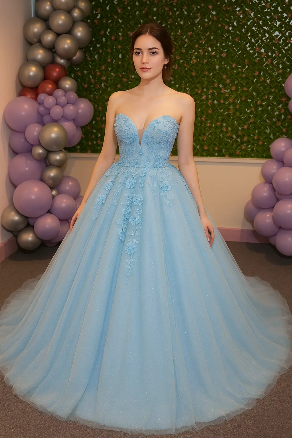 Meet the showstopper: a strapless sweetheart ballgown with a plunging illusion centre, scattered 3D floral appliqué and a cloud of glitter tulle that glows on the dancefloor; choose your vibe in Navy Blue, Baby Blue or Ivory.