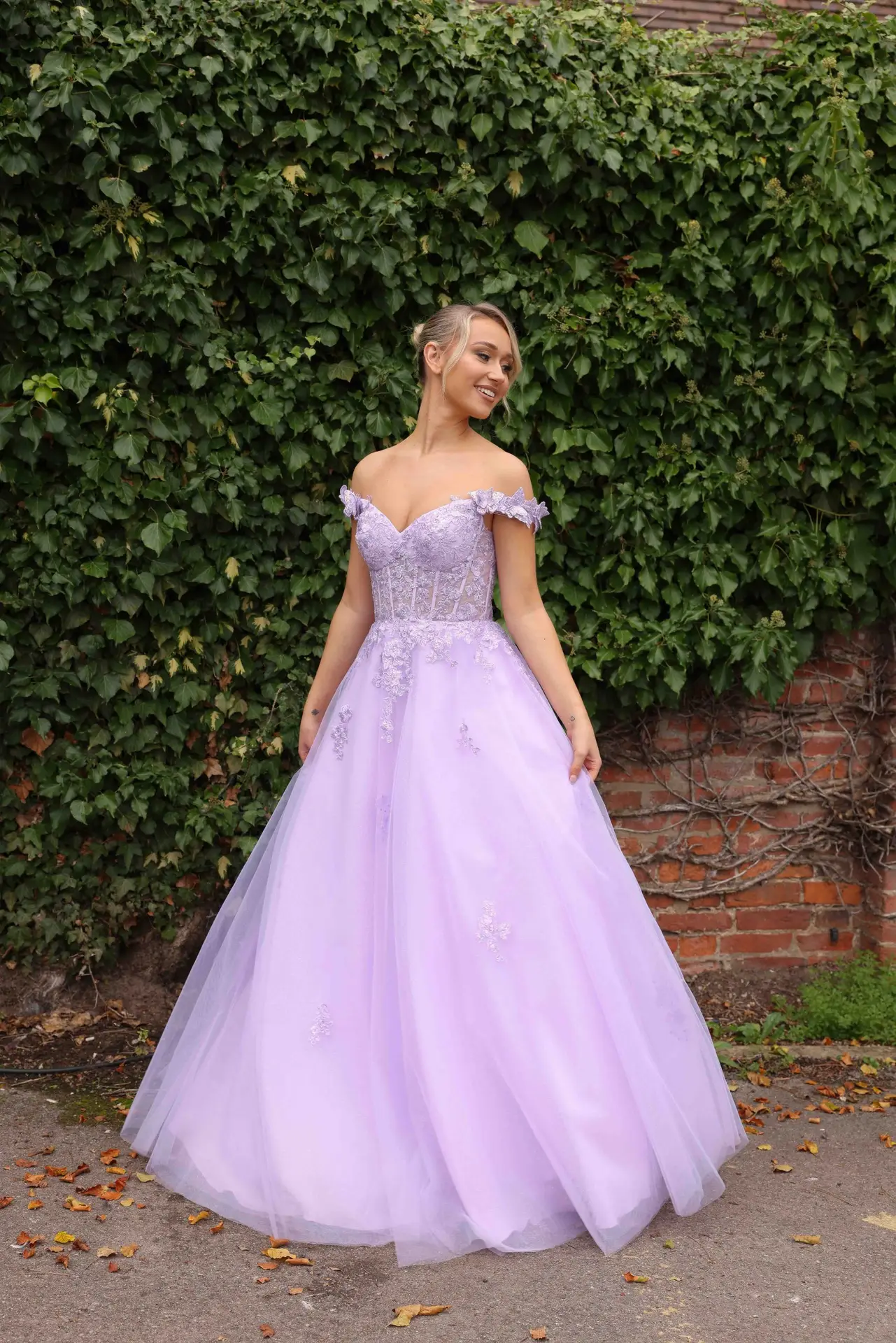 The structured bodice uses visible boning and cups for lift while the lace-up back lets you customise the fit securely. Soft off-shoulder straps sit comfortably on the upper arm, and the layered tulle skirt moves with airy volume, finishing in a gentle sweep train. Scattered lace appliqués add texture without weight—style simply with a delicate necklace or stud earrings to let the neckline shine.