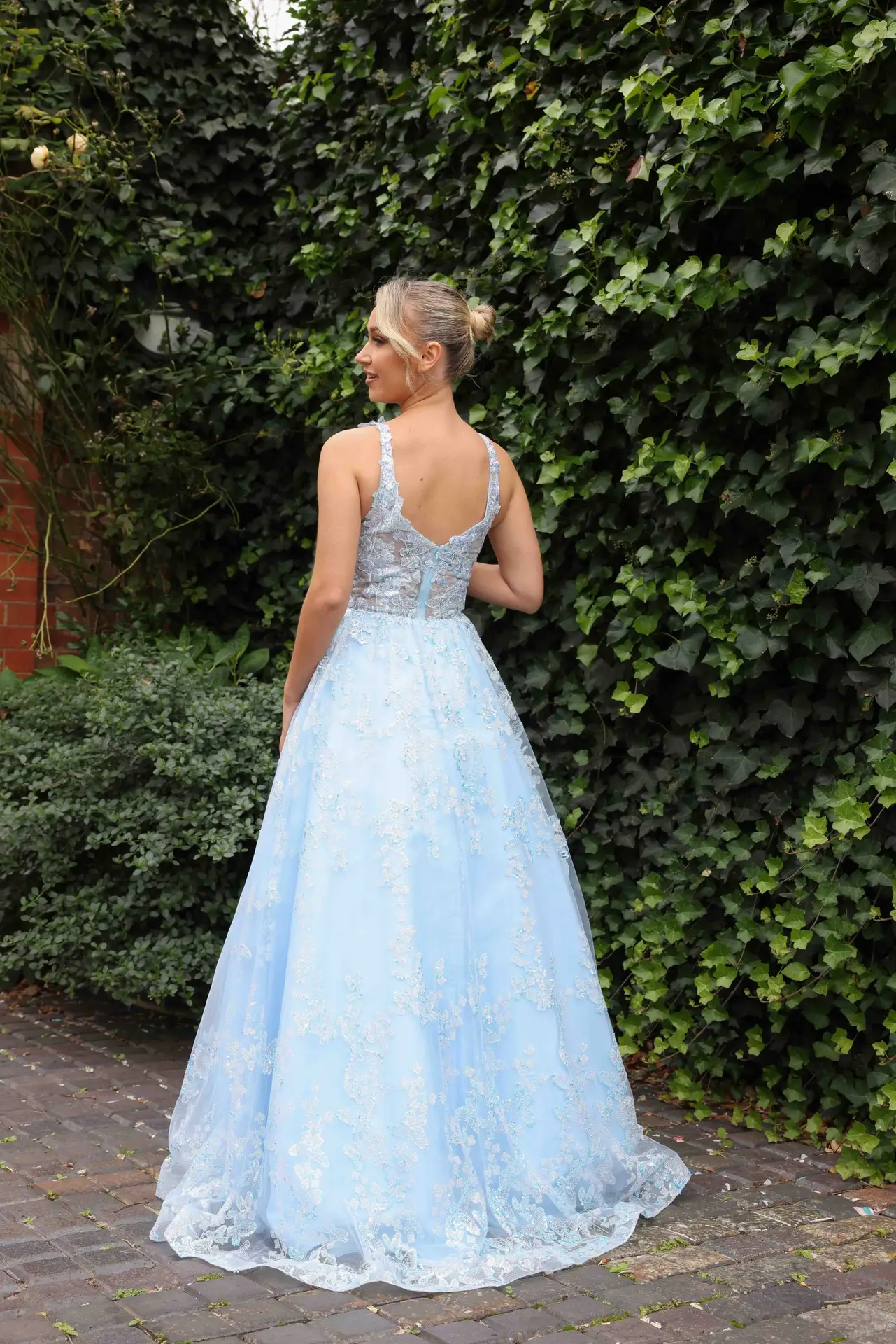 Feel like a true princess in the Estella gown, crafted from layers of soft tulle and finished with shimmering lace appliqués. The romantic V-neckline and full skirt create an effortlessly elegant look, perfect for your special night. In its soft Summer Sky blue, this dress will have you feeling like you’re floating on air. Experience the magic of this exclusive MK Prom gown by booking your fitting today! Book Now