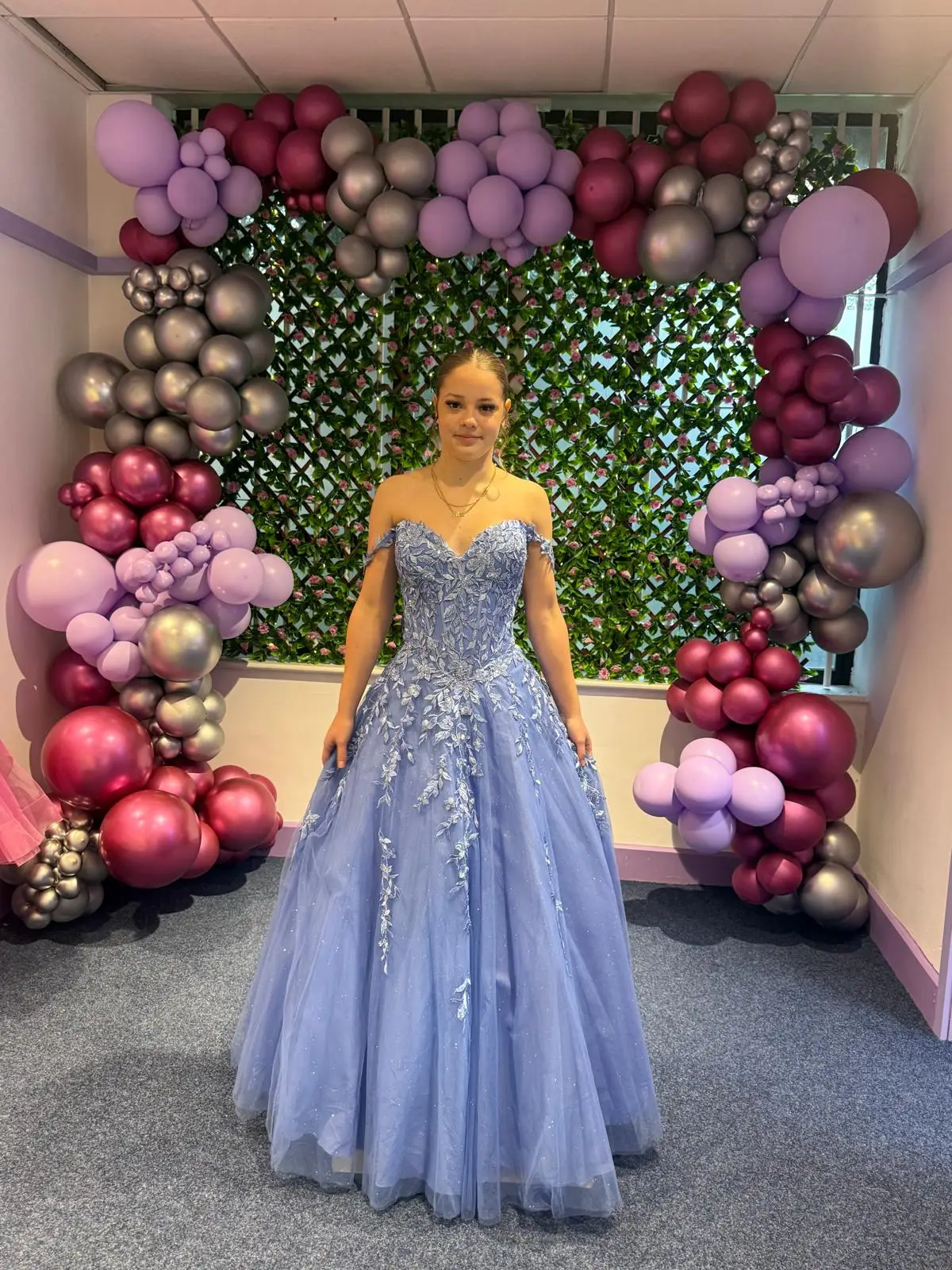 Larriana is a floral-appliqué ballgown with a sweetheart, off-the-shoulder neckline, glitter tulle skirt and a lace-up corset back for that secure, cinched finish. Available in Lemon, Hazel Blue and Orchid, it’s a floaty, photo-ready choice that feels as good as it looks.